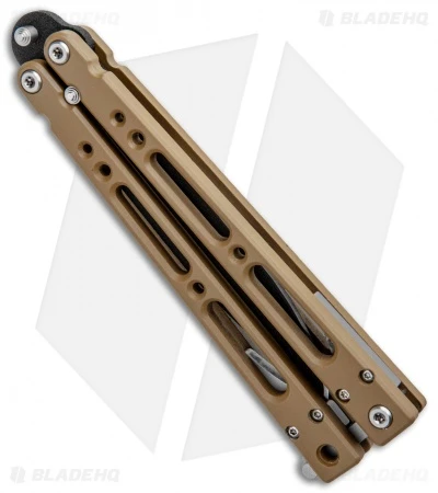 The Bear Song IV butterfly knife is a collaboration between BladeRunnerS (BRS) and Bear OPS. It is a lightweight flipper that is designed to be your go-to everyday carry knife. The B-400 model features coyote finished aluminum handles with stainless steel spacers and a swappable latch. The pivots have 304 bearing surfaces and phosphorus bronze washers. The black powder coated steel clip point blade has a double tang pin design for great performance.
