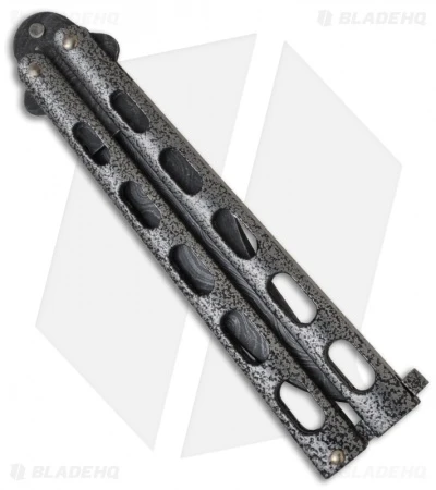Bear & Sons Knives present the 5″ Silver Vein Butterfly Knife with a Damascus blade with a single tang pin. This knife features a tough silver vein epoxy powder coated handle, which is textured silver paint over a black base. The handles feature a skeletonized design to reduce weight. This is a great priced butterfly knife made right here in the USA.