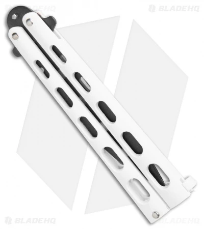 The Bear & Son 115BTR butterfly knife trainer is built with durable white epoxy coated zinc handles with a skeletonized design for reduced weight. It features a stainless steel drop point blade with a black coating.