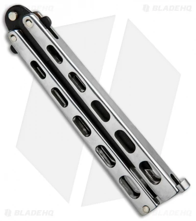 This Bear & Son SS15 butterfly knife has a black coated tanto blade and polished stainless steel handles. Stainless steel provides the strength and durability needed for a good balisong knife. The handles are skeletonized so it’s lightweight and fun to flip (we recommend some training videos and maybe taping the edge of the blade before diving into this). The knife includes a durable tail latch for holding the knife open, or securely locking it closed.