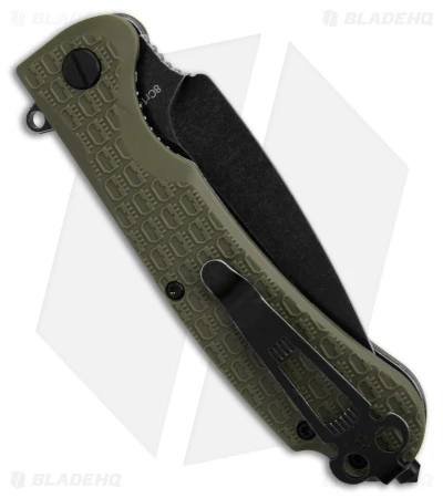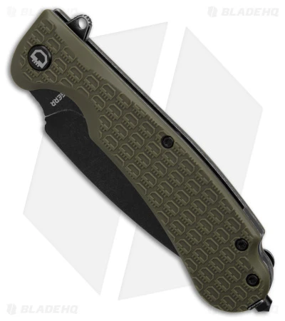 - Skull-like patterned, textured olive green FRN handle scales.