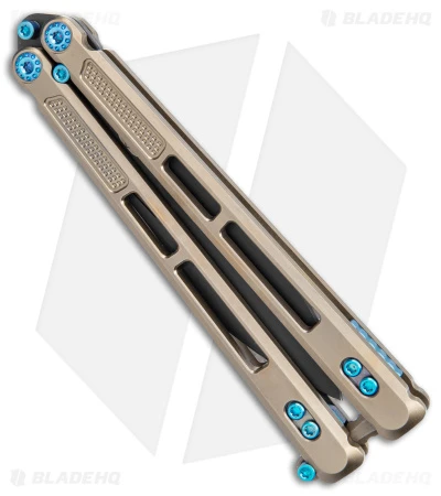 - Bronze-finished titanium handles with blue hardware.