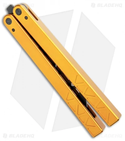 This Aztec Gold balisong trainer features a black blade and gold handles.