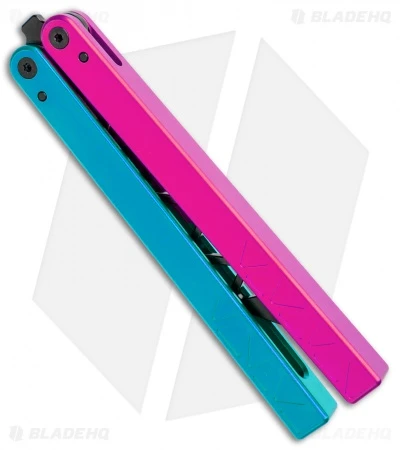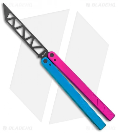 This Cotton Candy balisong trainer features a black blade and a pink handle and a blue handle.