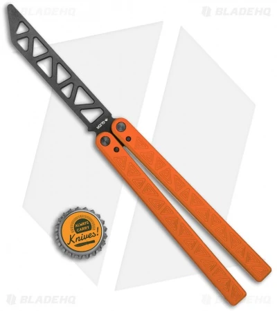 This Desert Orange balisong trainer features a black blade and orange handles.