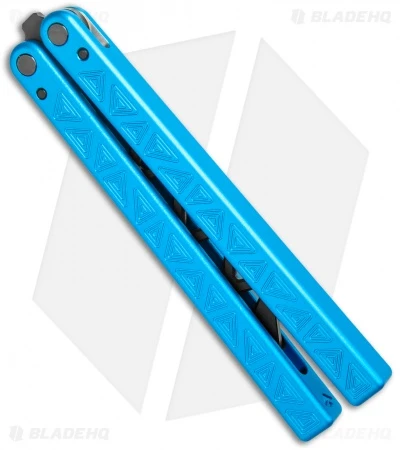 This Blade HQ Exclusive Sky Blue balisong trainer features a black blade with blue handles.