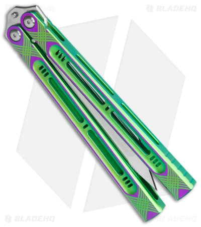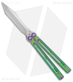 This Heibel Knives Menace Balisong Knife is a mid-tech from Blade Show East 2022! It has a modified tanto blade made of satin RWL-34 and has green and purple titanium handles.