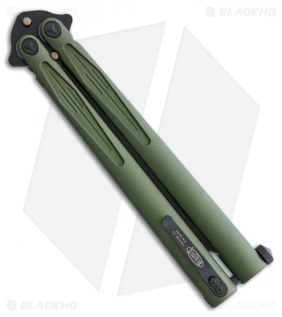 The latest generation of the Tachyon butterfly knife, the production Microtech Tachyon III, distinguishes itself from previous models with milled, single-piece channel construction handles, a spring latch, and a standard pocket clip. The blade showcases a non-sharpened swedge-ground tip and milled grooves with the Microtech logo, production date, and blade steel markings up front.