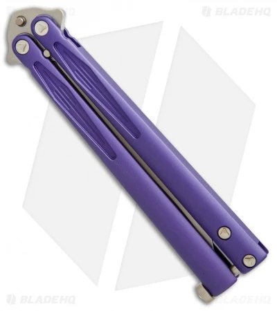 The latest generation of the Tachyon butterfly knife, the production Microtech Tachyon III, distinguishes itself from previous models with milled, single-piece channel construction handles, a spring latch, and a standard pocket clip. The blade showcases a non-sharpened swedge-ground tip and milled grooves with the Microtech logo, production date, and blade steel markings up front.