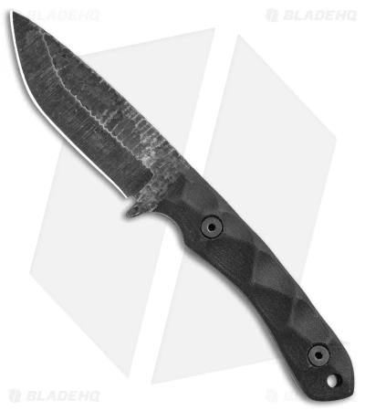 - Black stonewashed, hammer-finished drop point blade made from 1095 steel.